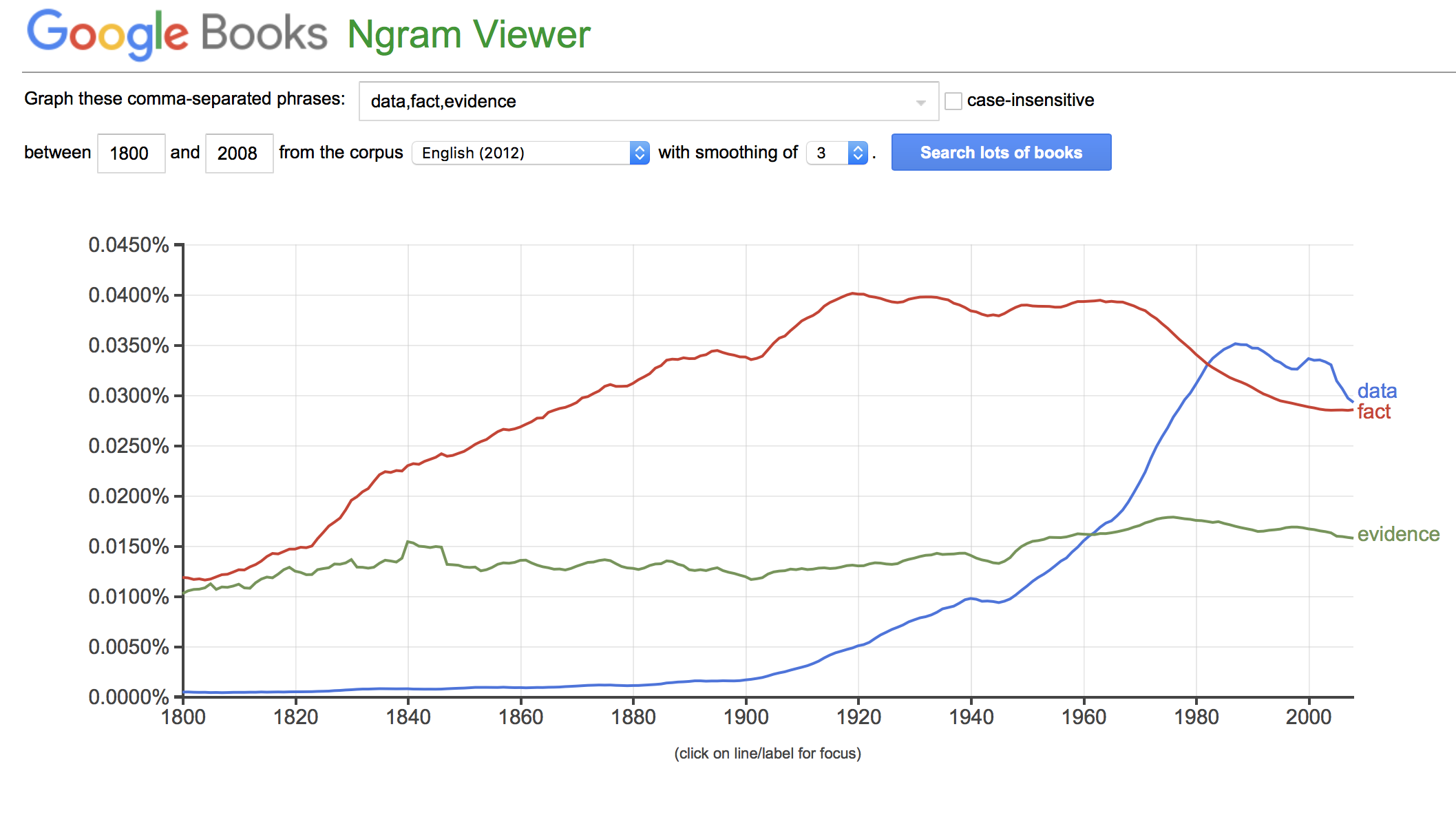 Sister terms – fact and evidence – depicted in the Google Books Ngram image above, highlight the trends in usage across centuries. No doubt the latitude the word enjoys and the rise of the digital explain the exponential growth in use in the late 20th early 21st century. Yet unlike a fact, data does not correspond with any ontological truth. For example, if a fact is proven wrong, it is no longer a fact, but false or incorrect data is still data (Rosenberg, 2013, p.18). In this sense, data is purely rhetorical. In some respects, this has been augmented by the increasing use of the word data as a mass noun with singular verb form – i.e. ‘this data’ as opposed to ‘these data’ – and the virtually non-existent use of the singular ‘datum’. Indeed, data no longer exists as isolated factoids, but as ‘aggregative’ datasets (Gitelman, 2013).