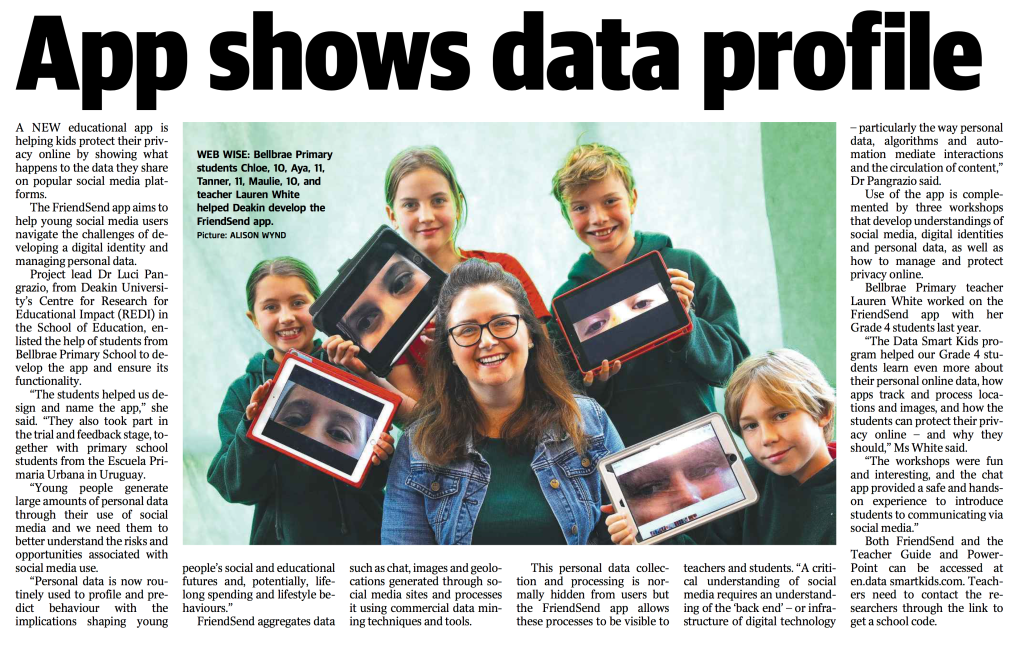 As explained in an earlier blog post, the Materialising Data project was designed to extend upon findings from the Data Smart Kids project (2018-2020). Funded by the Agencia Nacional de Investigation e Innovacion Uruguay, the Data Smart Kids project involved 250 kids in Australia and Uruguay. The project developed an educational chat app called ‘FriendSend’ along with a set of resources designed to build the critical data literacies of children. Now that the resources are freely available the project has been covered by local newspapers, namely the Geelong Advertiser and the SurfCoast Times.